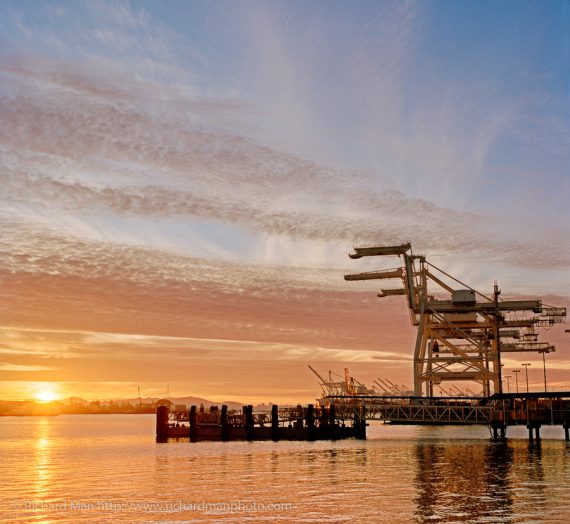 The website was getting a bit stale and in need of a redesign. Thanks to the amazing web designer at Fantastic Realities, this is now a WordPress powered site. I have been blogging on the new site for a couple months now, and tonight the old URL http://richardmanphoto.com redirects to this site http://richardman.photo. You can still contact me at richard@richardmanphoto.com. Meanwhile, please enjoy this sunset photo of the Oakland cranes, rumored to be the inspiration for the Star Wars “At-At” Imperial walkers.